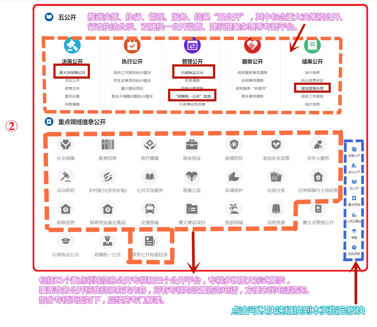 政務(wù)公開頻道頁主要包含:①信息公開制度、指南;②法定主動公開內(nèi)容;③政策公開;④會議公開;⑤政務(wù)“五公開”;⑥重點領(lǐng)域信息公開;⑦公共企事業(yè)單位信息公開;⑧政府公報;⑨依申請公開;⑩相關(guān)專題。