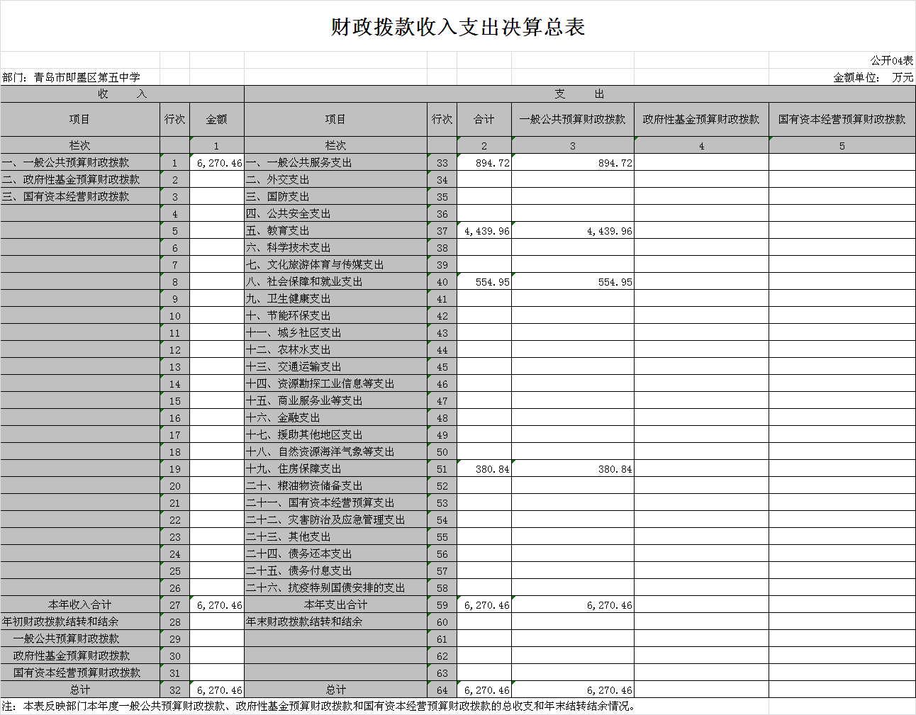 2022年度財(cái)政撥款收、支總計(jì)6270.46萬(wàn)元。與2021年度相比,財(cái)政撥款收、支總計(jì)各增加194.53萬(wàn)元,增長(zhǎng)3.2%。主要是一般公共預(yù)算財(cái)政撥款、教育支出、社會(huì)保障和就業(yè)支出和住房保障支出增加。