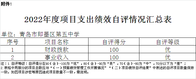 今年在單位決算中反映了2022年度全部區(qū)級(jí)預(yù)算項(xiàng)目績(jī)效自評(píng)情況,以及“財(cái)政撥款”“事業(yè)收入”2個(gè)項(xiàng)目的績(jī)效自評(píng)表。
