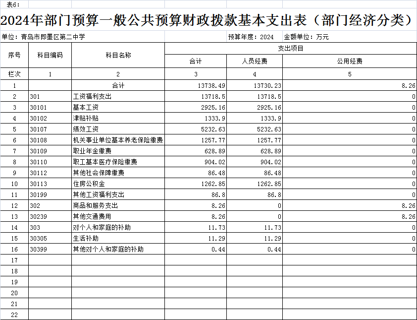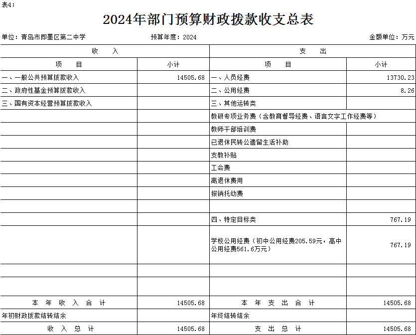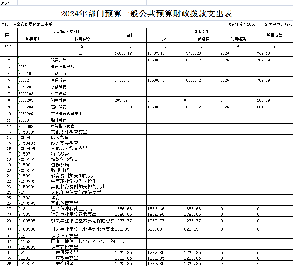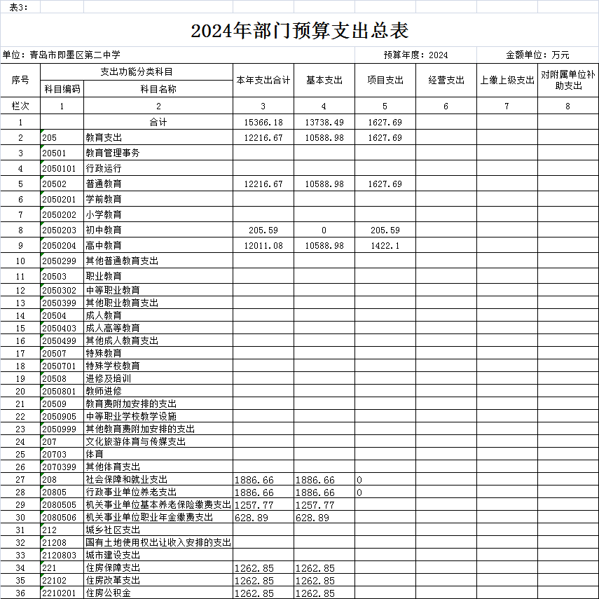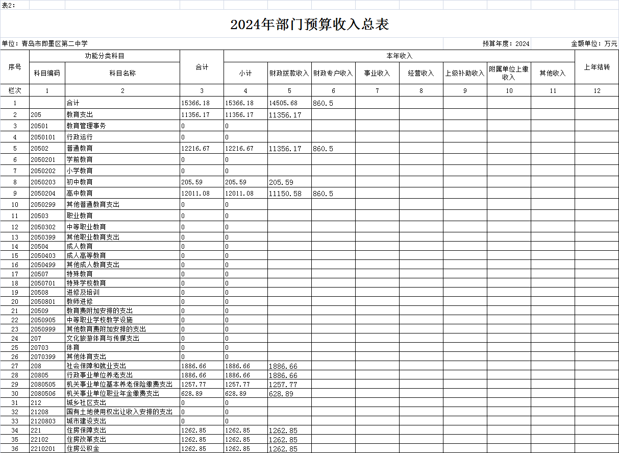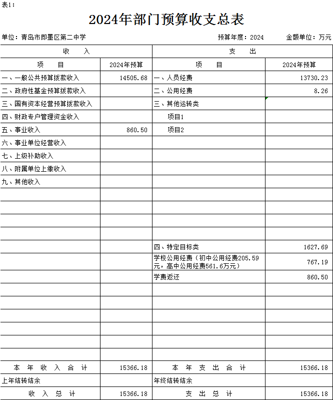 按照綜合預算的原則,青島市即墨區(qū)第二中學所有收入和支出均納入單位預算管理。按照收支平衡原則,青島市即墨區(qū)第二中學2024年收支總預算均為15366.18萬元,其中單位收入包括:一般公共預算撥款收入14505.68萬元、事業(yè)收入860.5萬元;支出包括:教育支出12216.67萬元、社會保障和就業(yè)支出1886.66萬元、住房公積金1262.85萬元。