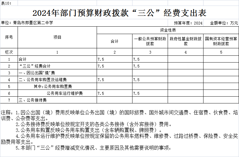 2024年,通過財政撥款安排的“三公”經(jīng)費預算共7.5萬元,比2023年與上年持平。其中:因公出國(境)經(jīng)費0萬元。公務用車運行維護費和購置費7.5萬元,公務用車運行維護費7.5萬元與上年持平;公務用車購置費0萬元,與上年持平。公務接待費0萬元,與上年持平。