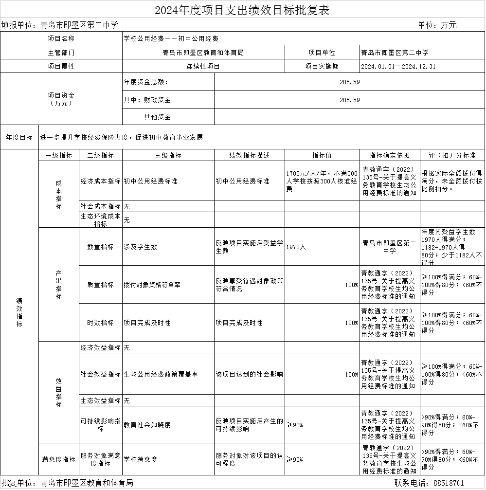 1.初中公用經(jīng)費:由青島市即墨區(qū)第二中學實施,實施周期為一年,年度預算安排公用經(jīng)費205.59萬元,學生數(shù)1970人,公用經(jīng)費標準1700元/生/年,隨班就讀11000元/生/年,生均公用經(jīng)費覆蓋率100%,公用經(jīng)費撥付時效及時。依據(jù)《關于以深化教育扶貧為突破口加快推動鄉(xiāng)村教育發(fā)展的實施方案》的通知(青教通字[2018]80號)和《進一步完善城鄉(xiāng)義務教育經(jīng)費保障機制的通知》(青政發(fā)[2016]31號規(guī)定,進一步提升學校保障能力,促進初中教育發(fā)展。