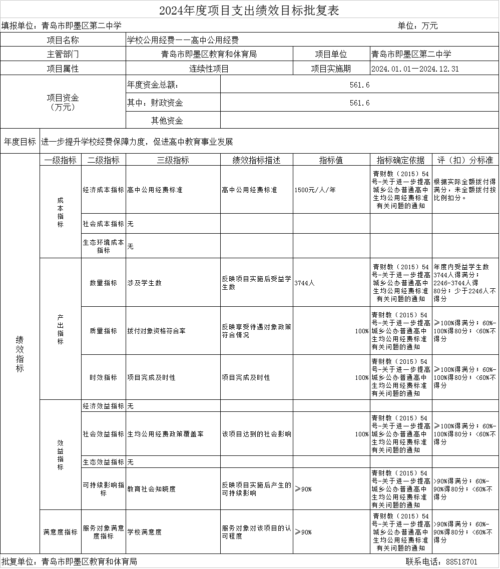 2.高中公用經(jīng)費:由青島市即墨區(qū)第二中學實施,實施周期為一年,年度預算安排561.6萬元,學生數(shù)3744人,公用經(jīng)費標準1500元/生/年,生均公用經(jīng)費覆蓋率100%,公用經(jīng)費撥付時效及時。依據(jù)《關于進一步提高城鄉(xiāng)公辦普通高中生均公用經(jīng)費標準有關問題的通知》(青財教〔2015〕54號)規(guī)定,進一步提升學校保障能力,促進高中教育發(fā)展。