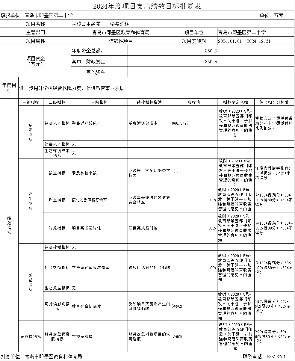3.學費返還:由青島市即墨區(qū)第二中學單位實施,實施周期為一年,年度預算安排860.5?萬元,撥付對象資格符合率100%,資金撥付時效及時。根據(jù)《山東省5單位關于進一步加強和規(guī)范教育收費管理的意見的通知》(魯教財字〔2020〕12號)規(guī)定,進一步提升學校保障能力,促進學校發(fā)展。
