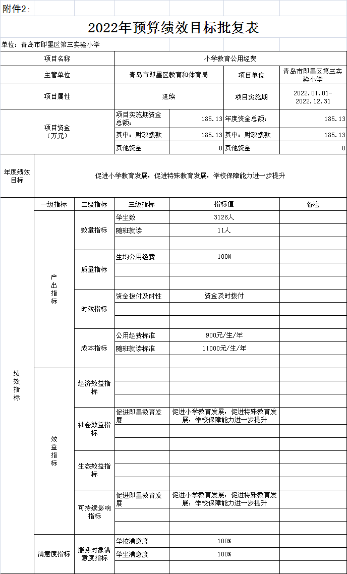 1.小學公用經(jīng)費:由青島市即墨區(qū)第三實驗小學單位實施,實施周期為一年,年度預算安排185.13萬元,績效指標中學生數(shù)3126人,隨班就讀學生數(shù)11人;公用經(jīng)費標準900元/生/年,隨班就讀標準11000元/生/年,生均公用經(jīng)費覆蓋率100%,公用經(jīng)費撥付時效及時。依據(jù)《關(guān)于以深化教育扶貧為突破口加快推動鄉(xiāng)村教育發(fā)展的實施方案》的通知(青教通字[2018]80號)和《進一步完善城鄉(xiāng)義務(wù)教育經(jīng)費保障機制的通知》(青政發(fā)[2016]31號規(guī)定,進一步提升學校保障能力,促進小學教育發(fā)展。依據(jù)關(guān)于印發(fā)《即墨市特殊教育提升計劃(2014-2016年)》的通知(即政發(fā)[2015]25號)、《關(guān)于印發(fā)《青島市第二期特殊教育提升計劃(2018-2020年)》的通知》(青教通字[2018]5號)規(guī)定,進一步提升學校保障能力,促進特殊教育發(fā)展。