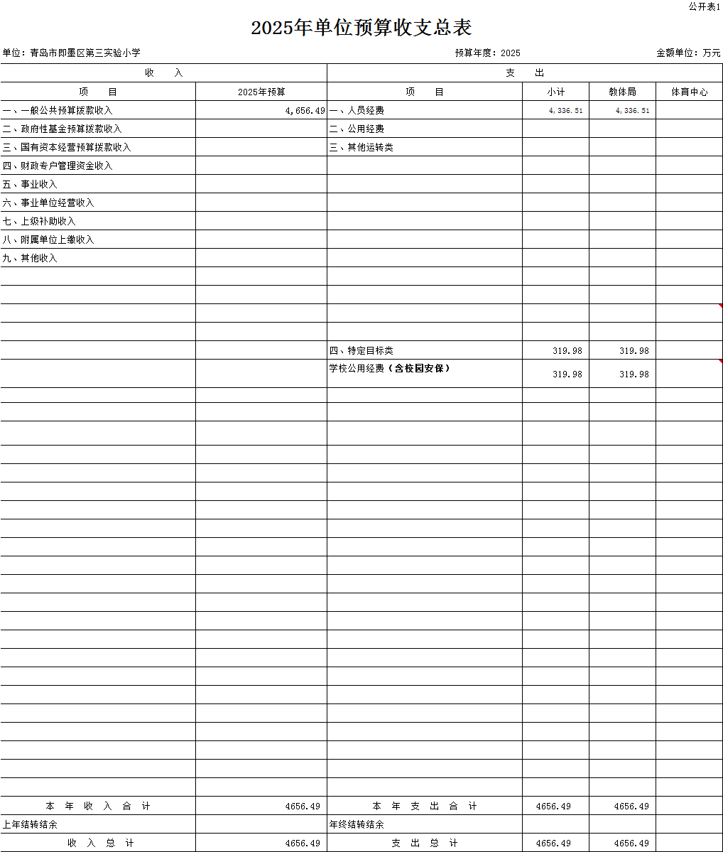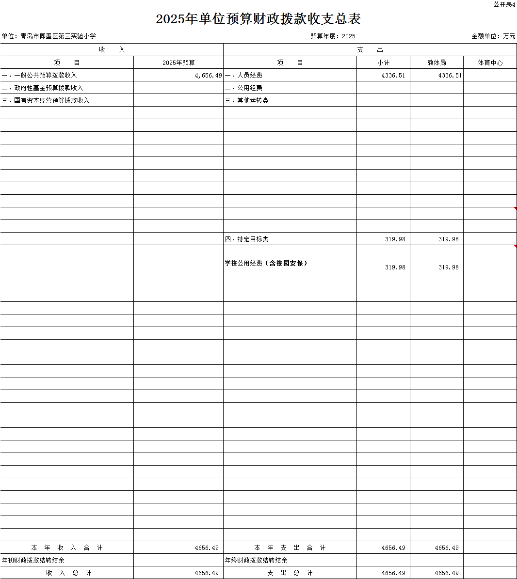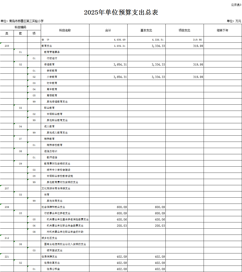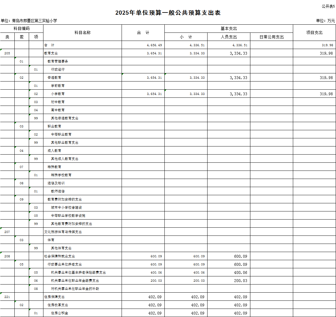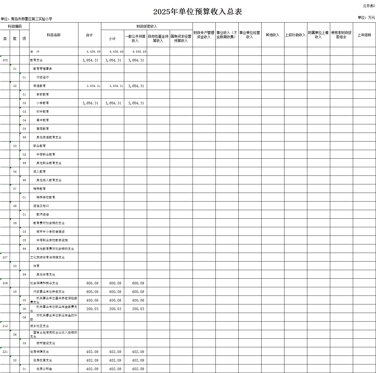 按照綜合預(yù)算的原則,青島市即墨區(qū)第三實驗小學(xué)所有收入和支出均納入單位預(yù)算管理。按照收支平衡原則,青島市即墨區(qū)第三實驗小學(xué)2025年收支總預(yù)算均為4656.49萬元,其中單位收入包括:一般公共預(yù)算撥款收入4656.49萬元;支出包括:教育支出3654.31萬元、社會保障和就業(yè)支出600.09萬元、住房保障支出402.09萬元等。