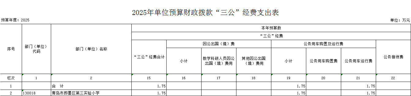 2025年,通過財政撥款安排的“三公”經(jīng)費預(yù)算共1.75萬元,比2024年增長5.7%。其中:因公出國(境)經(jīng)費0萬元。公務(wù)用車運行維護費和購置費1.75萬元,公務(wù)用車運行維護費1.75萬元,主要原因油費單價增加,維修增多。公務(wù)用車購置費0萬元,上年持平。公務(wù)接待費0萬元,上年持平。