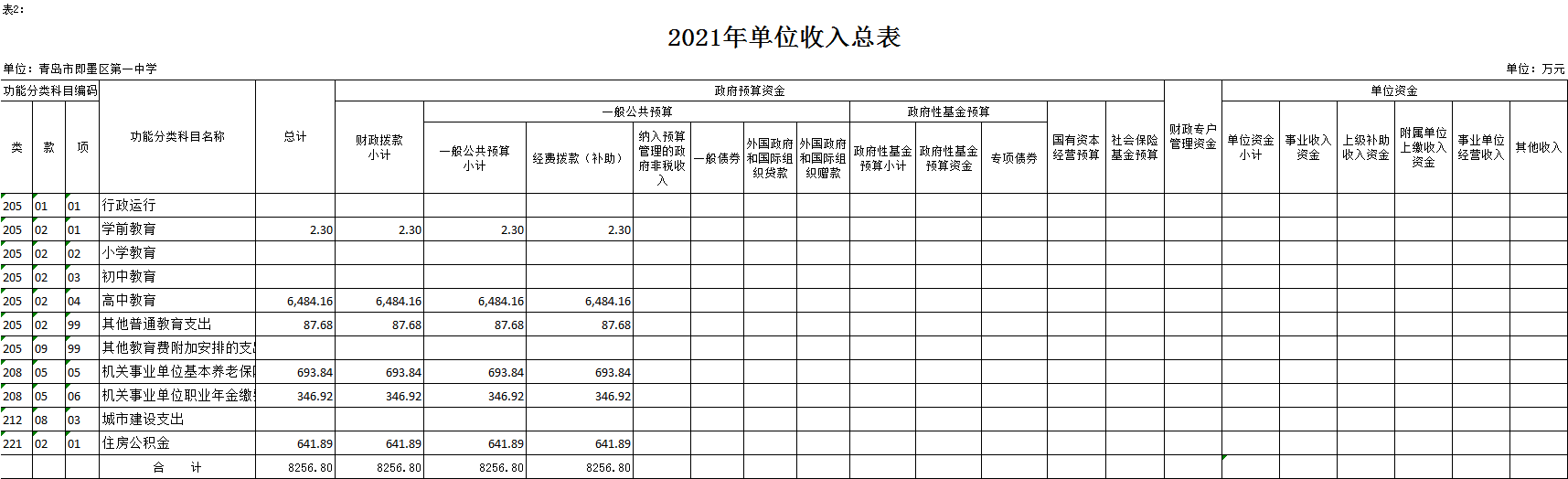 二、2021年單位收入總表