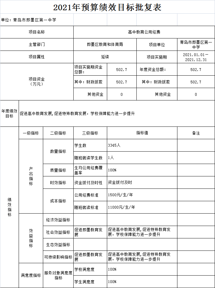 2.高中公用經(jīng)費:由青島市即墨區(qū)第一中學(xué)實施,實施周期為一年,年度預(yù)算安排502.7萬元,學(xué)生數(shù)3345人,隨班就讀人數(shù)1人,公用經(jīng)費標(biāo)準(zhǔn)1500元/生/年,隨班就讀標(biāo)準(zhǔn)11000元/生/年,生均公用經(jīng)費覆蓋率100%,公用經(jīng)費撥付時效及時。通過高中教育公用經(jīng)費的保障,促進(jìn)高中教育發(fā)展,促進(jìn)特殊教育發(fā)展,學(xué)校保障能力進(jìn)一步提升。