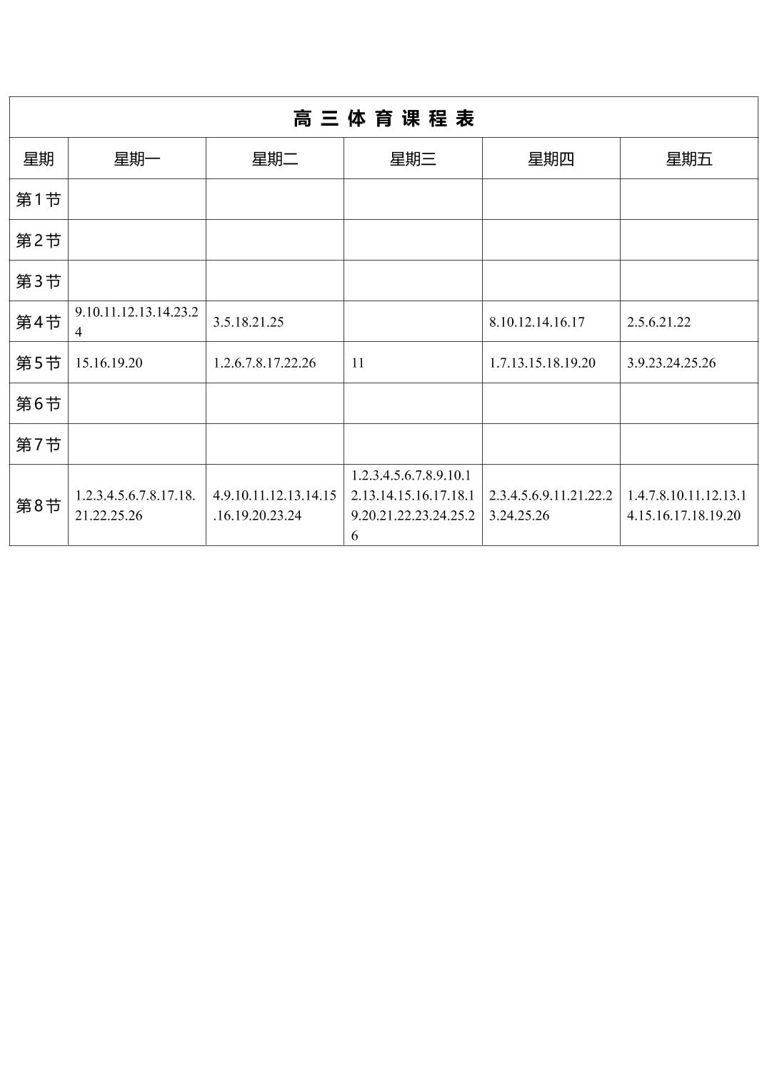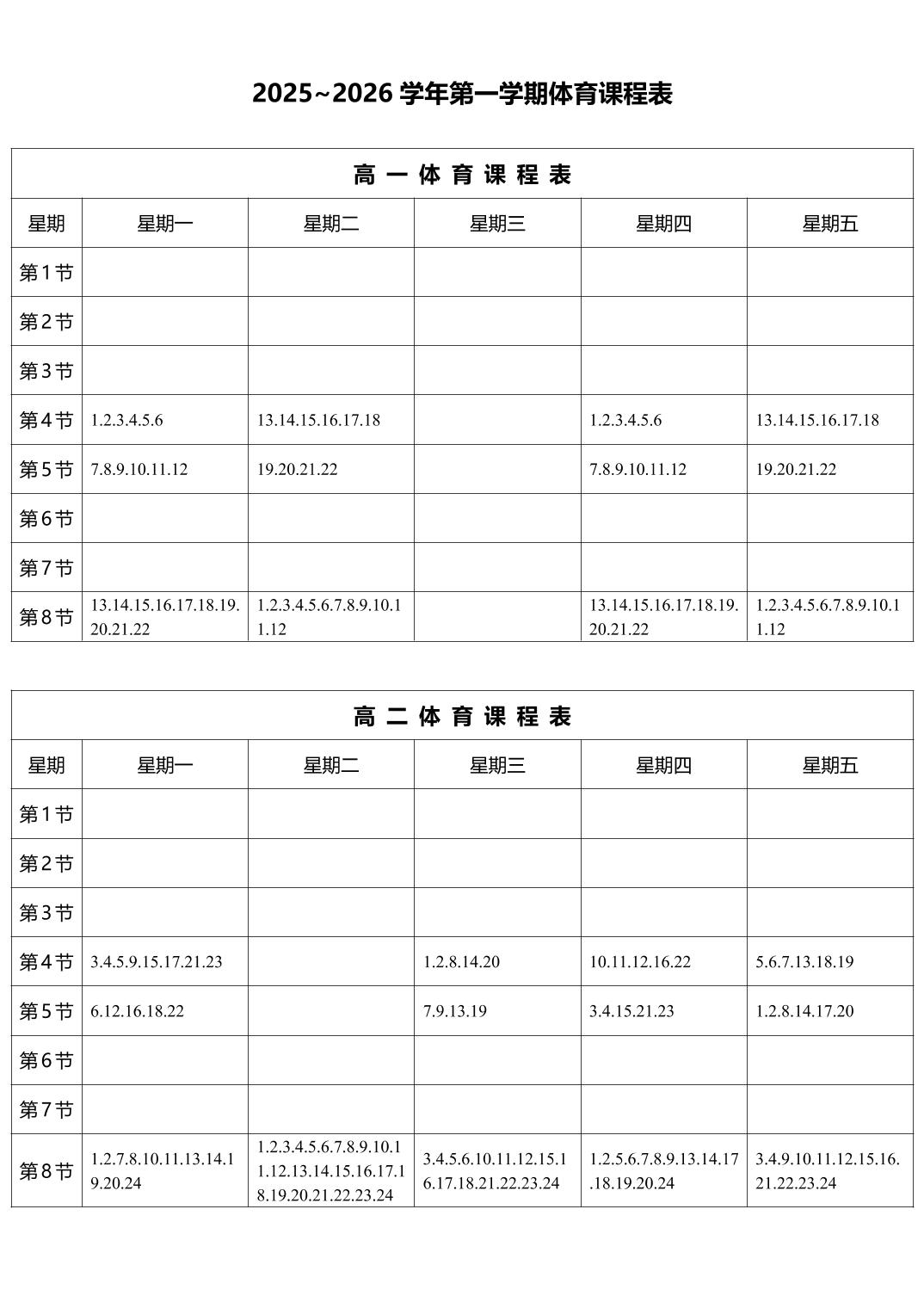 2025-2026學年第一學期體育課程表