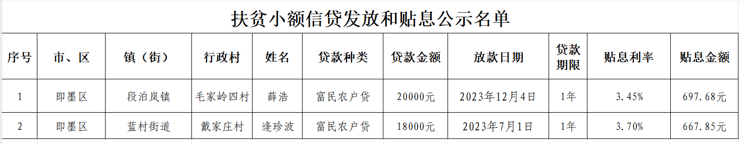 2022年8月,區(qū)鄉(xiāng)村振興局(現(xiàn)農(nóng)業(yè)農(nóng)村局)、區(qū)財(cái)政局和中國(guó)農(nóng)業(yè)銀行股份有限公司即墨分行簽訂《青島市即墨區(qū)齊魯富民貸、小額扶貧信貸貼息資金和風(fēng)險(xiǎn)補(bǔ)償金三方監(jiān)管協(xié)議》,開(kāi)始實(shí)施小額扶貧信貸業(yè)務(wù)。現(xiàn)將近期發(fā)放的扶貧小額信貸(貼息)予以公告,公告期為10天。